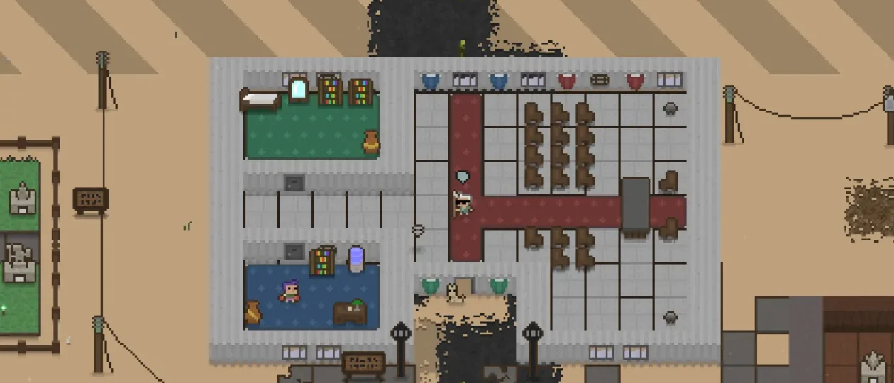 The visual style features pixel graphics in a top-down perspective, combining familiar indie aesthetics with a dystopian yet absurd tone. Think giant rhinos, space cubes, and llama racing. Additionally, despite its open-world and sandbox elements, the travel mechanics may feel restrictive compared to more fully open worlds.