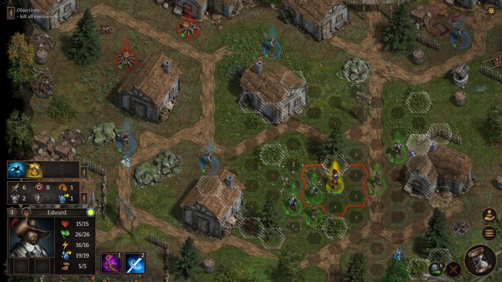The combat system is another key point, and I’m enjoying the careful balance between challenge and punishment. Combat takes place on a hex-grid and is turn-based, requiring careful positioning, thoughtful unit selection before a battle, and effective use of the environment. Factors such as morale, fatigue, line of sight, terrain, and weather all impact the outcome of fights, which I appreciate. Not everything is about having the most magic or blades. Environmental interactivity is another important part of combat, and you can deal with threats through cool things such as freezing rivers, building barricades to funnel enemies into kill zones, and so on. It’s pretty cool, and I wish more turn-based RPGs had more environment interactivity.